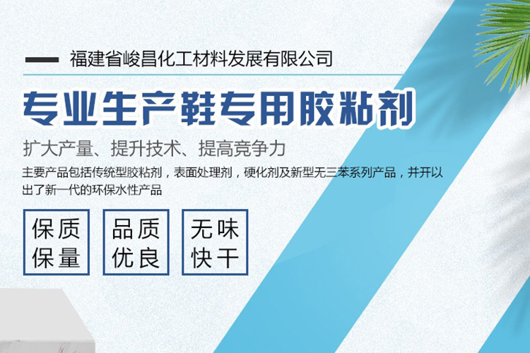 福建省峻昌化工材料發(fā)展有限公司總部設(shè)在中國(guó)鞋鄉(xiāng)——晉江。為更好、更方便服務(wù)廣大客戶,我司在廣東江門及福建均設(shè)有先進(jìn)的PU膠生產(chǎn)基地,歡迎廣大同行前來我司灌裝或批發(fā)銷售。公司是一家中外合資,面向亞太地區(qū)從事研究,生產(chǎn)銷售鞋用粘膠10多年的專業(yè)公司。從國(guó)外引進(jìn)生產(chǎn)能力為數(shù)萬噸的全套先進(jìn)生產(chǎn),檢驗(yàn)設(shè)備,與德國(guó)Bayer,日本DENKA及美國(guó),西班牙等其它海外公司有著密切的原材料及技術(shù)合作。公司主要產(chǎn)品包括傳統(tǒng)型膠粘劑,表面處理劑,硬化劑及新型無三苯系列產(chǎn)品,并開以出了新一代的環(huán)保水性產(chǎn)品。供應(yīng)國(guó)內(nèi)外鞋業(yè),手提箱包及建筑工程單位使用。公司始終保持產(chǎn)品的良好品質(zhì)及專業(yè)特性,并倍受廣大客戶好評(píng)。